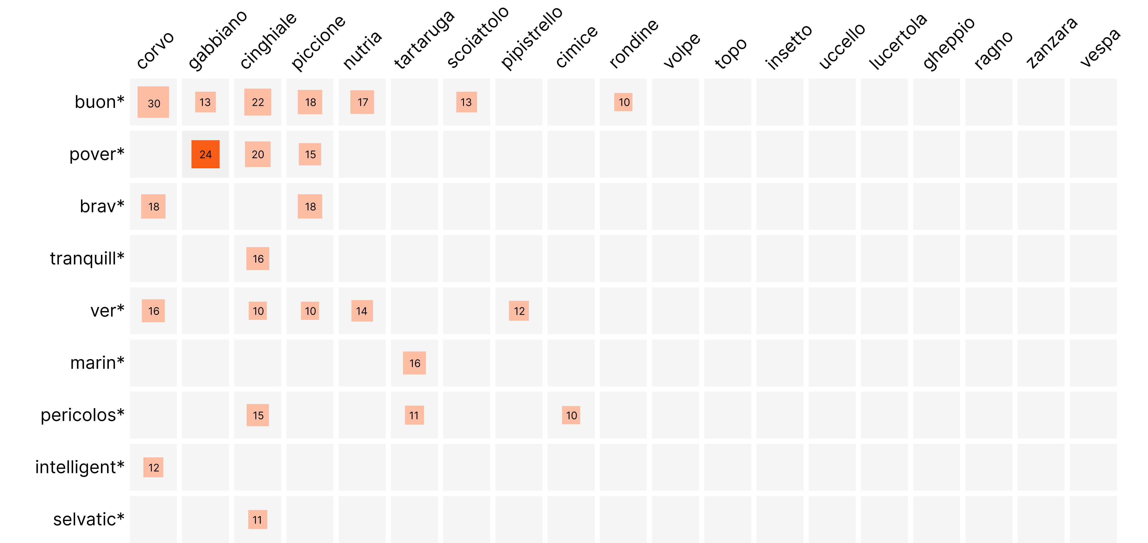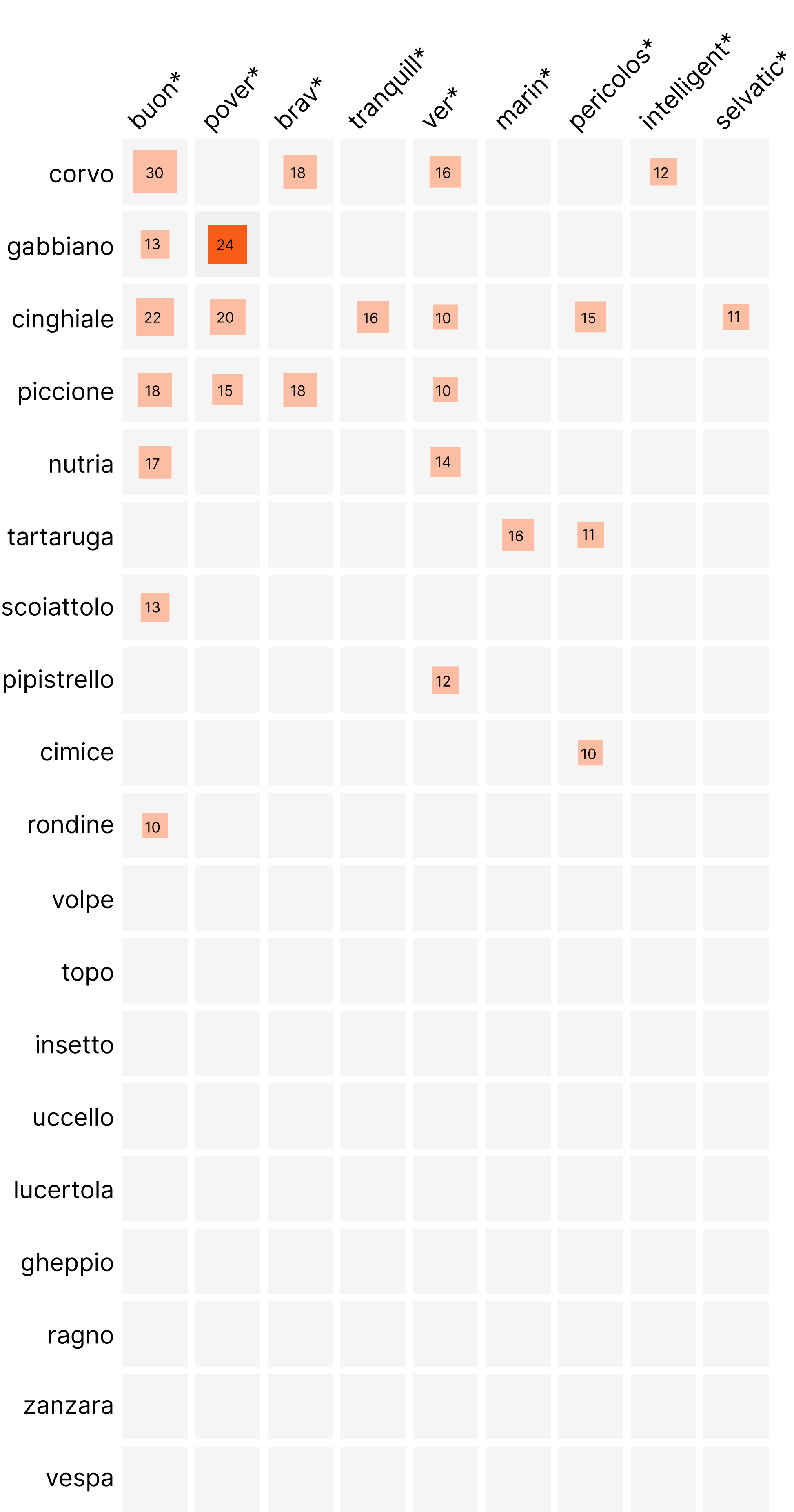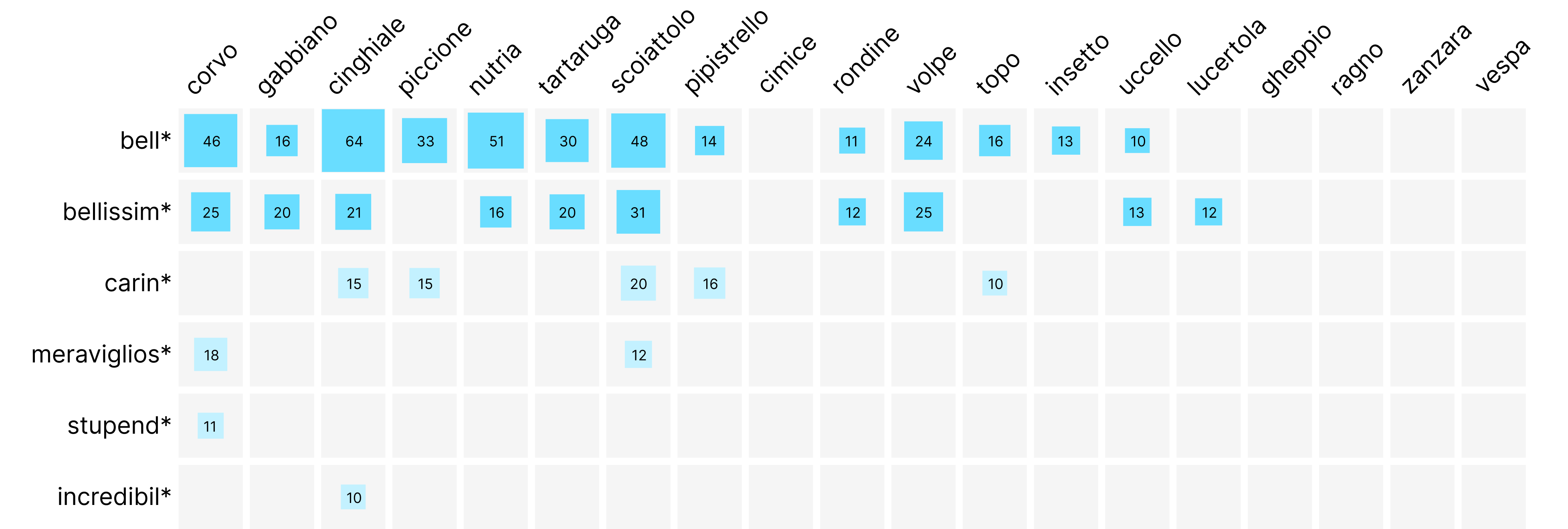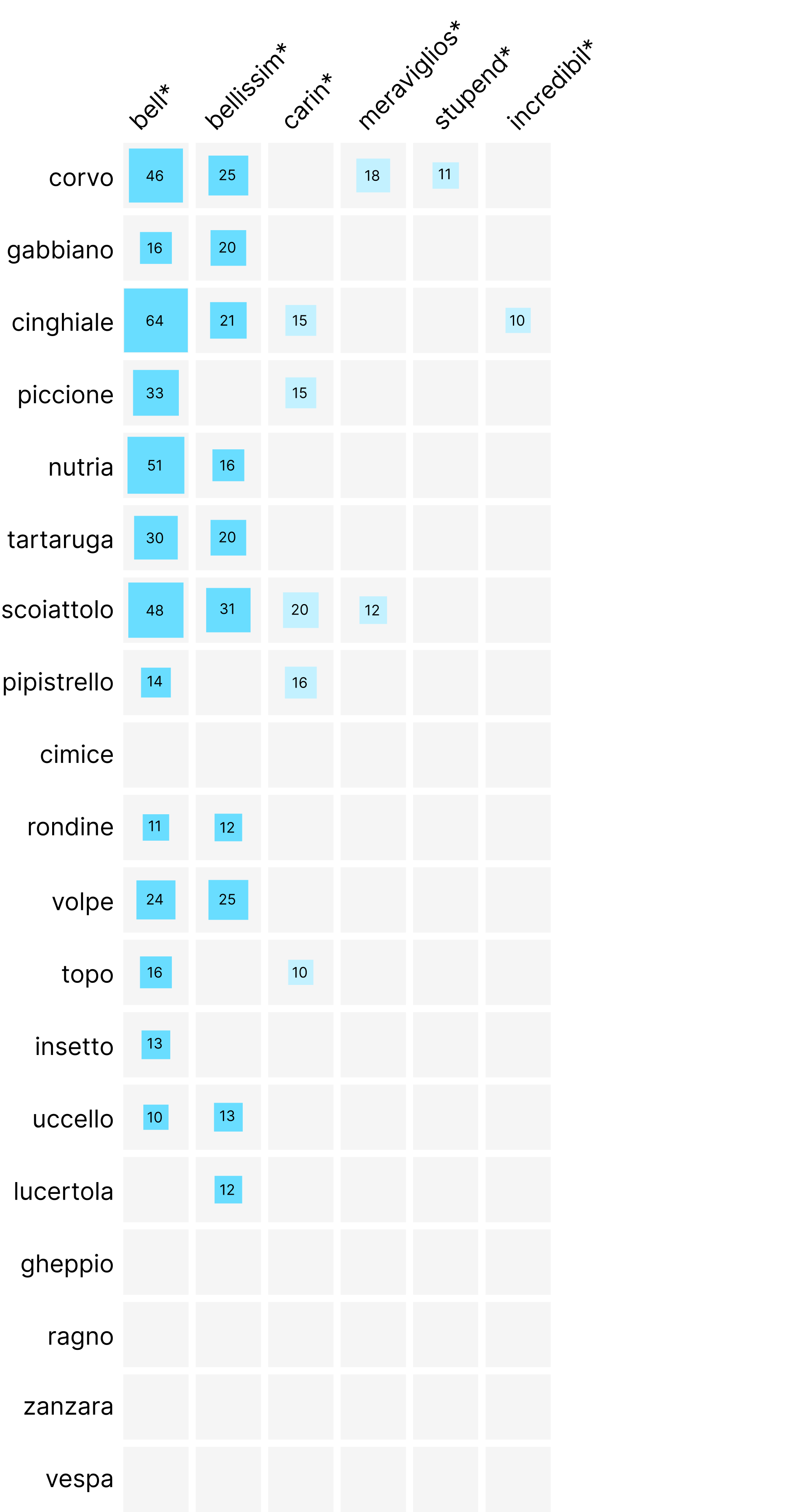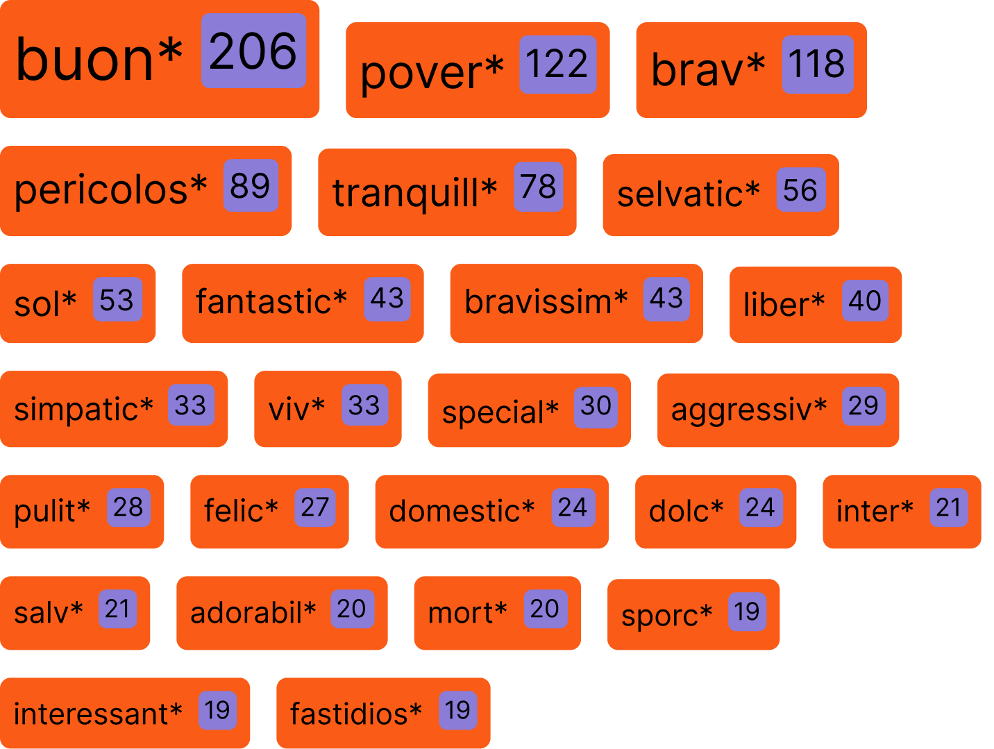 Tra tutti gli animali, l'aggettivo più usato è “bello”.