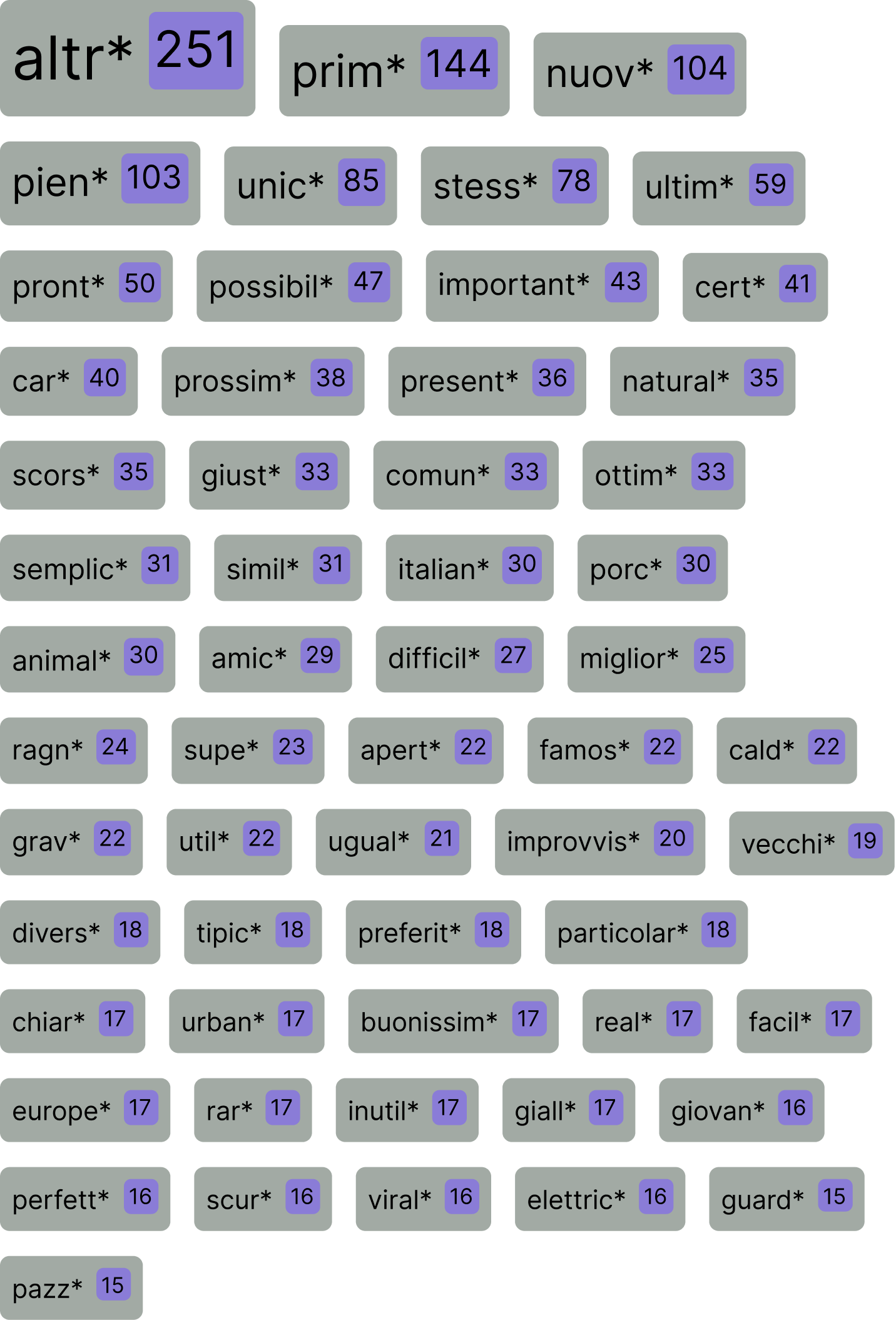 Aggettivi utilizzati almeno 15 volte all'interno del dataset, ordinati